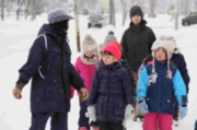 雪が細かく降る中,1・2年生が冬道教室を行いました。今年は雪が少ないといえども,歩道はつるつるであったり,ジャンパーのフードをかぶると周りが見えにくかったり,帽子をかぶると周りの音も聞こえにくかったりというようなことが起こります。そういった夏とは違った危険があることを,交通指導員の方がわかりやすく教えてくださりました。お話のあとは実際に路上へ出ての歩行を行いながら学習をしました。子ども達は,ふだん思わずしてしまっている危険に気付き,改めて交通安全の意識を高めるよい機会となりました。