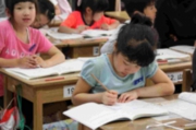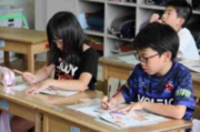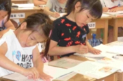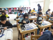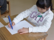 5年生の教室には44人分の机が並んでいます。4月からは、これまでの「ふれあいルーム」を5年生教室にリニューアルし、子どもたちは、のびのびと過ごしていました。この時間は、書写の授業でした。筆先をうまく使うためにマルを書いたり、直線を美しく書く練習をしたりしながら、文字の基礎を身に付けていたところでした。