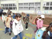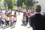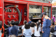 地震が起きて、その後に火事が起きるという設定の避難訓練を行いました。4月になり学年が変わって、教室も変わったため、授業中に担任が誘導しての避難訓練です。「お・か・し・も」の合言葉通り、話し声ひとつなく、迅速に避難が出来ました。その後、1,2年生は消防自動車の見学をしました。見たことのない装置がたくさんついていて、興味津々の様子でした。