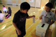 今週から児童会が企画した「スマイル運動」を20分休みに行っています。全校児童にくじをひいてもらい,そのくじによってチームが決められます。1チーム10人程度で構成され,割り当てられた曜日にチームが20分休みに体育館へ集合します。そして,チーム対抗「輪くぐり対決」を行います。全員で手をつなぎ1つの輪になり,フラフープを3分間で何人がくぐって,そのフラフープのバトンを渡せるかを競いました。1~6年生がふれあい楽しいイベントになりました。
