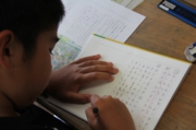 5年生の教室には44人分の机が並んでいます。4月からは、これまでの「ふれあいルーム」を5年生教室にリニューアルし、子どもたちは、のびのびと過ごしていました。この時間は、書写の授業でした。筆先をうまく使うためにマルを書いたり、直線を美しく書く練習をしたりしながら、文字の基礎を身に付けていたところでした。