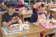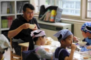 今週より給食が開始された1年生。今日はみんなが楽しみにしているカレーライスでした。給食準備が始まる頃には、市の食育指導員の方が来校してくださり、配膳の仕方や食器の並べ方、食べ方などの指導を行ってくださいました。1年生は、たいへん行儀よく、マナーを守ってカレーライスの味を堪能していました。