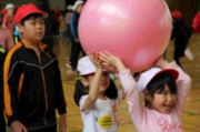 恵みの雨 新競技「たてわり対抗大玉」練習