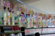 図書室へ行ってみると,子どもたちが何やらあちこちウロウロしているので,尋ねてみると「あたりと書いてあるしおりを探しているの」と教えてくれました。どうやら図書委員会の企画で,宝を探し当てると図書委員の児童が製作したしおりがプレゼントされるようです。図書室に多くの友達に足を運んでもらいたいという願いを込めての企画でした。そして,図書室にはボランティアさんの企画「七夕イベント」で作成した,子どもたちの願い事が書かれた短冊が飾られていました。